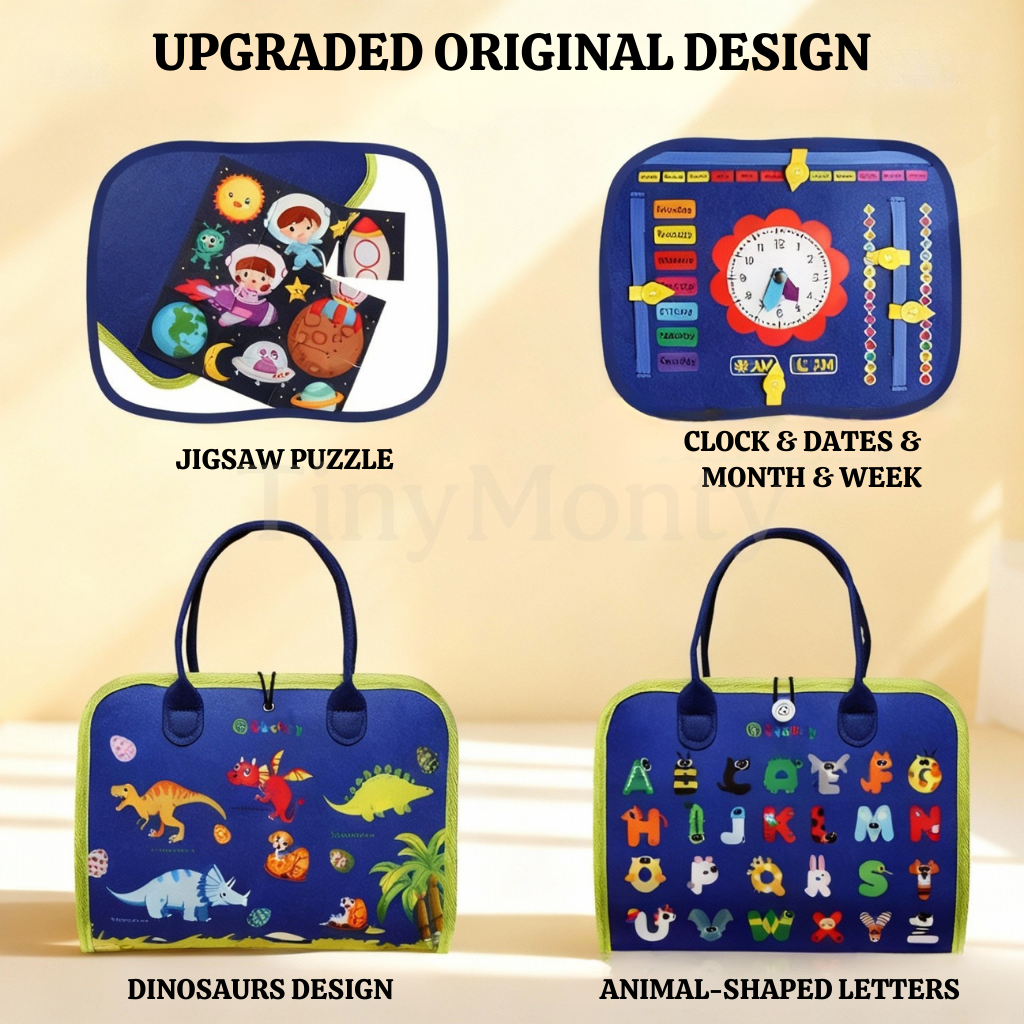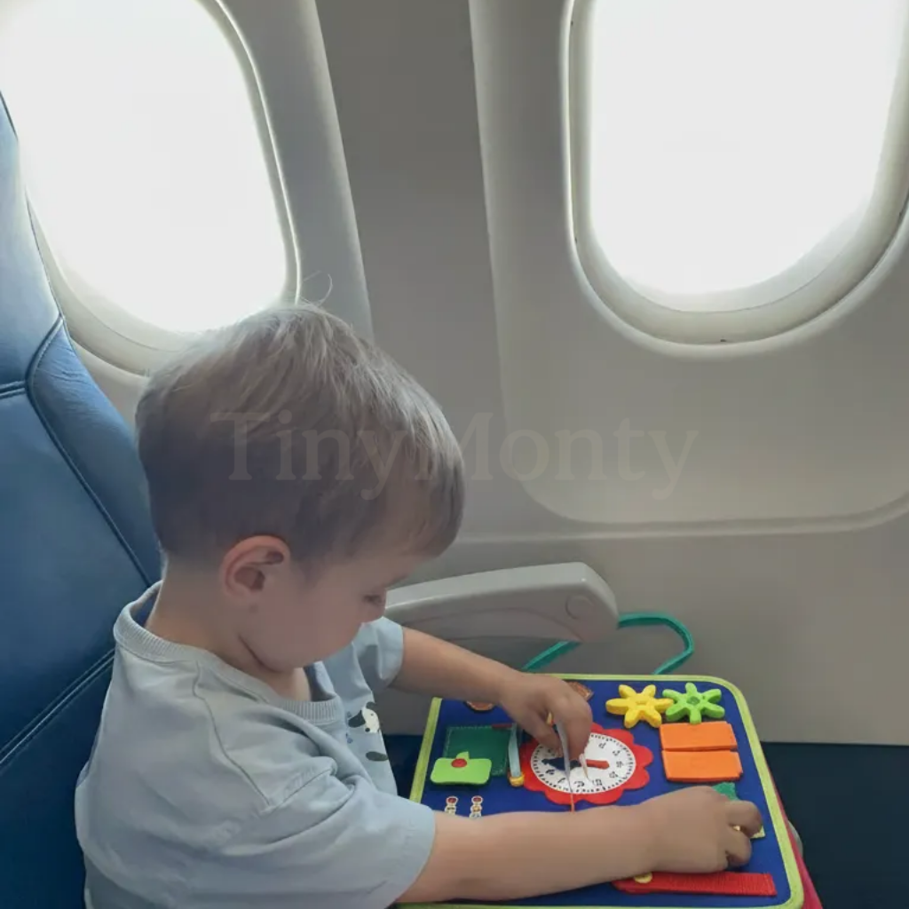 • Montessori Busy Board – A portable, 4-page activity board filled with zippers, buckles, snaps, shoelaces, clocks, puzzles, and more — perfect for improving fine motor skills and on-the-go focus.